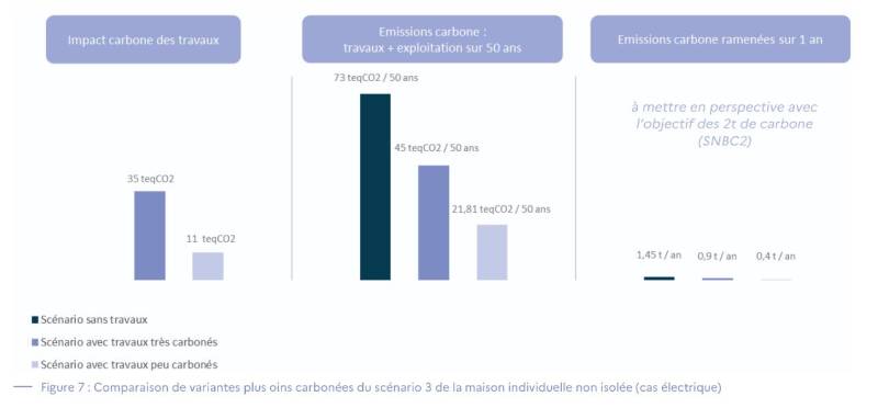 - une rénovation peu carbonée s'approche d'1 années d'émissions individuelle moyenne ou 7 années de consommation de logement moyenne. Le retour sur investissement est abaissé à 15 ans environs. Soit une division par 2.