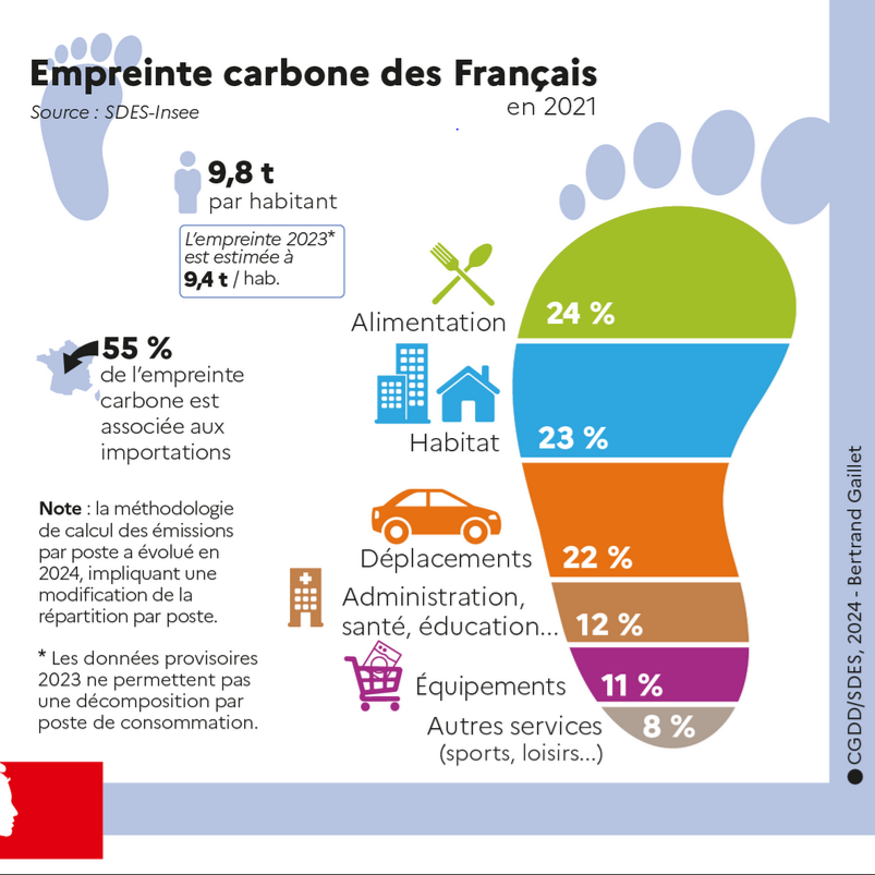 A titre de comparaison, les émissions individuelles en 2024 s'élèvent en moyenne à 9,4 téqCO2 par an et par habitant en France, importations comprises.
