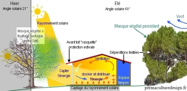 L'inertie doit pour sa part être réfléchie selon les principes du bioclimatisme. L'effet recherché est l'été de ne pas stocker la chaleur provenant de l'environnement extérieur et absorber le surplus de chaleur pénétrant à intérieur, l'hiver de restituer toute la chaleur possible et capter l'énergie provenant de l'extérieur. La place que prendront les murs et planchers capteurs sera fonction des ouvertures vitrées, et les occultations des parois vitrées à prévoir suivant la course du soleil, sous différentes formes : débords de toit, pergolas, brises soleils orientables (BSO) et masques végétal.